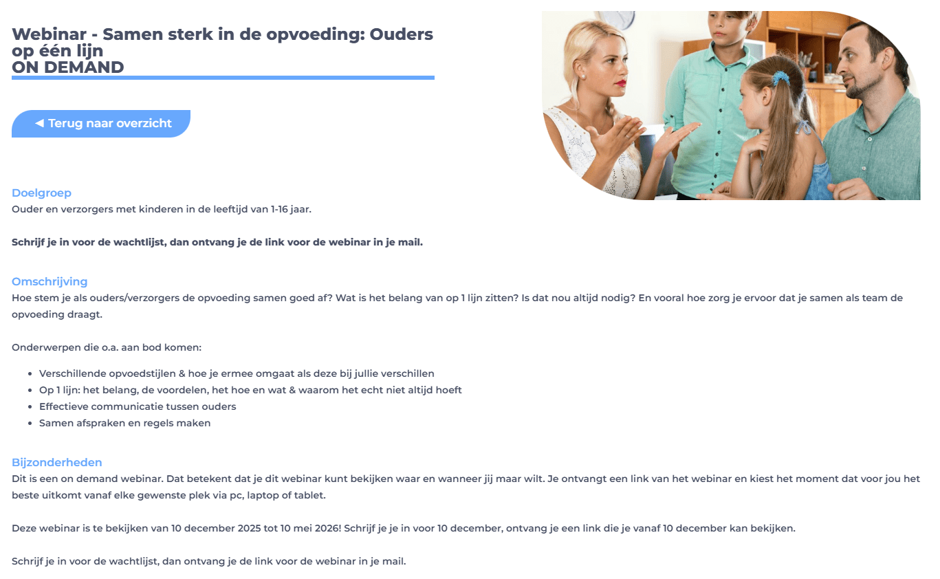 Centrum Jeugd en Gezin brengt graag de webinar ‘Samen sterk in de opvoeding: Ouders op één lijn’ onder de aandacht. Inschrijven kan via de link: Webinar – Samen sterk in de opvoeding: Ouders op één lijn <br>ON DEMAND